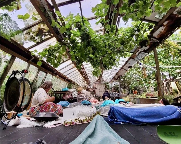 Open woodland spa (sauna, hot tub, plunge), grounding meditation, breath, slow yoga and journalling, tea & chats by the fire.
